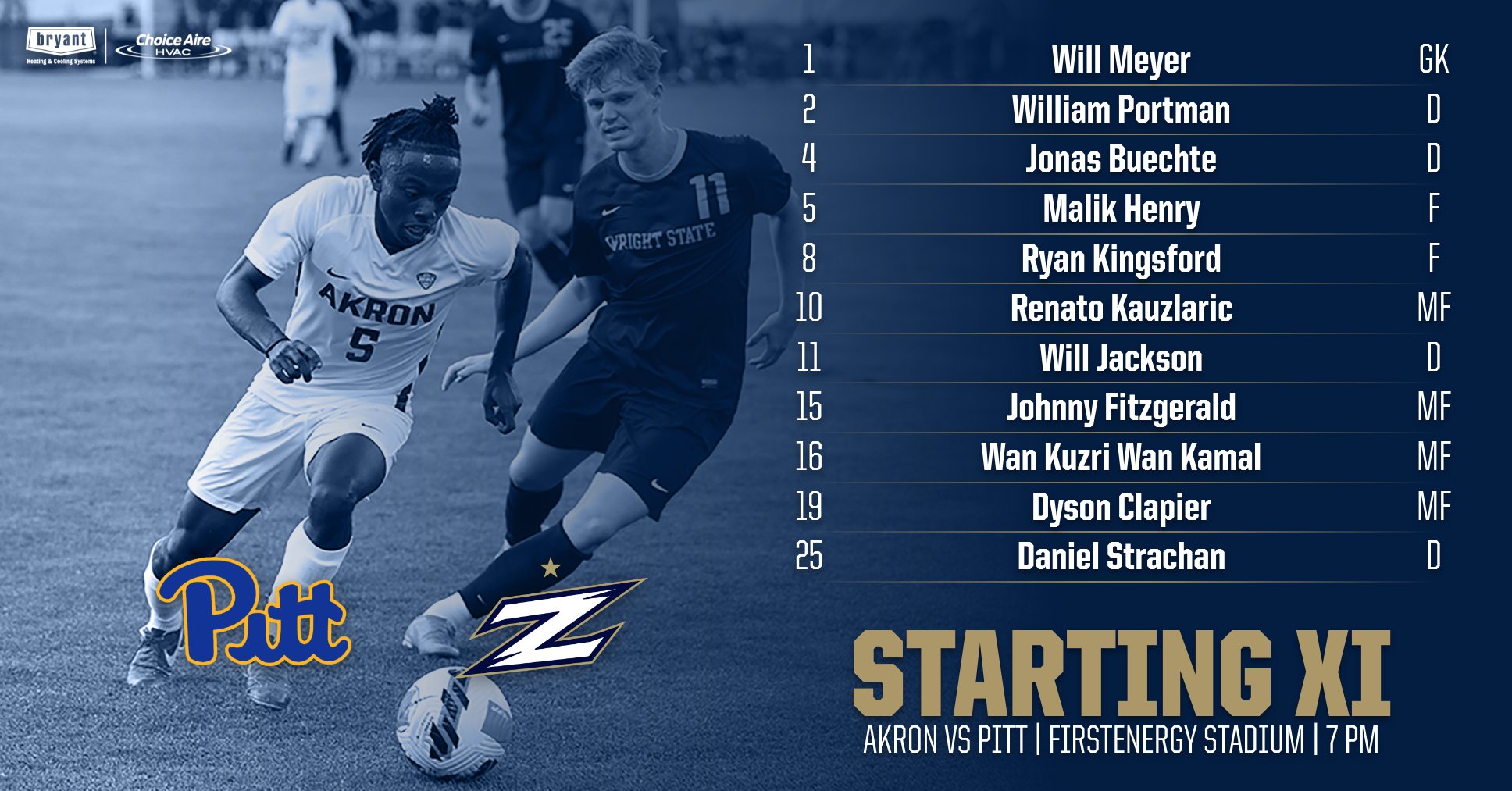Akron Zips M Soccer On Twitter Tonight S Zipsmsoc Starters Presented By Bryant Heating Amp Cooling As Akron Battles No 3 Pitt At 7 Pm Findaway Monday Sept 6 7 Pm
